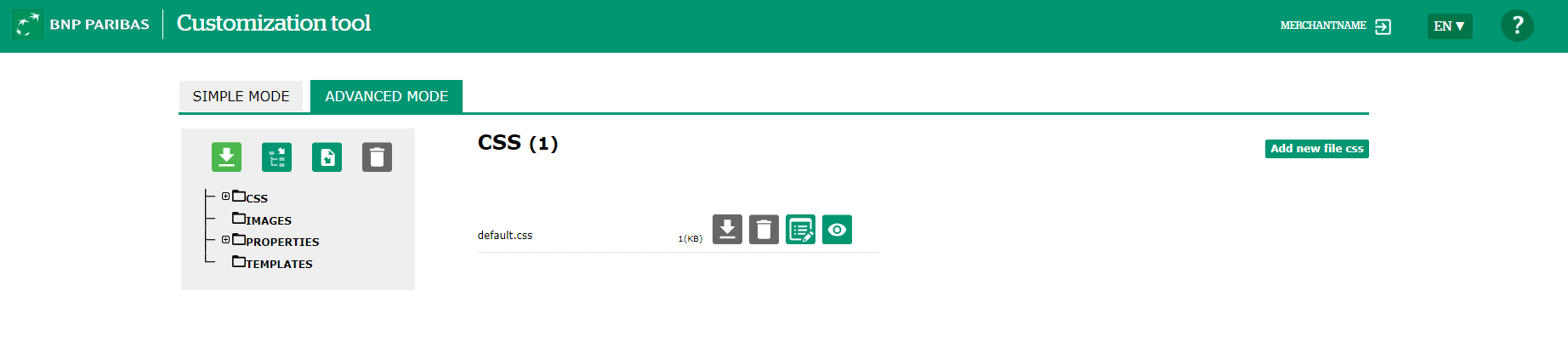The advanced mode lets you create or upload your customization elements to the tool and preview the appearance of the pages. This mode is reserved for people who can use HTML5 and CSS3 web technologies.