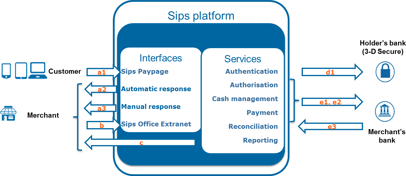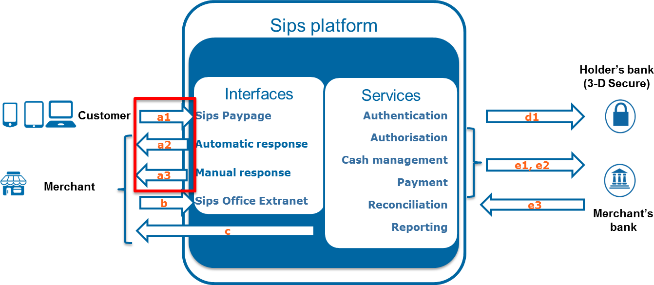 | a2 | Automatic response | 24 hours a day | Response sent by the Mercanet server to you once the payment has been made. This response is sent automatically regardless of what the customer does. |