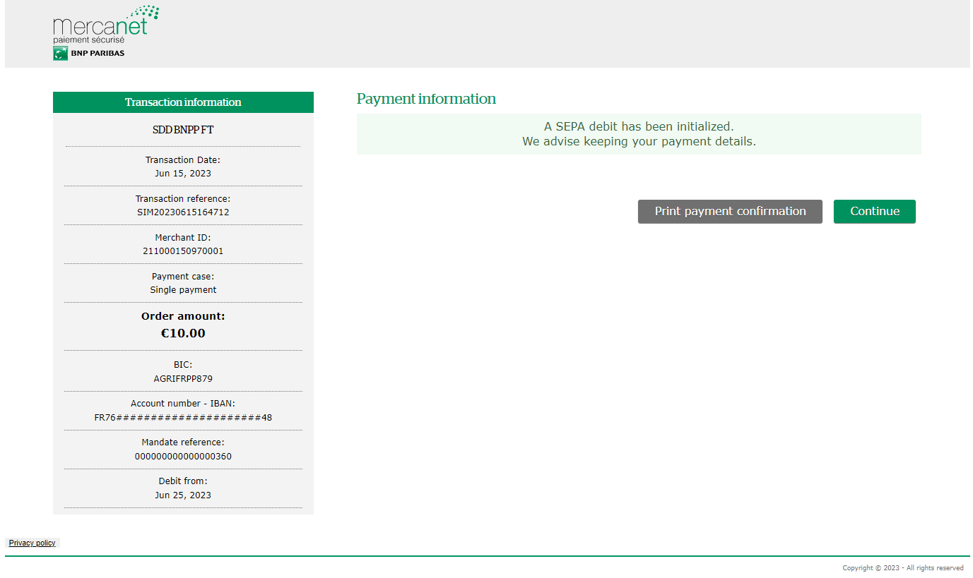 The electronic validation of SEPA direct debit mandates is used during an online mandate creation by the client or an electronic mandate creation in Mercanet Back Office or in Office (M2M) by you.