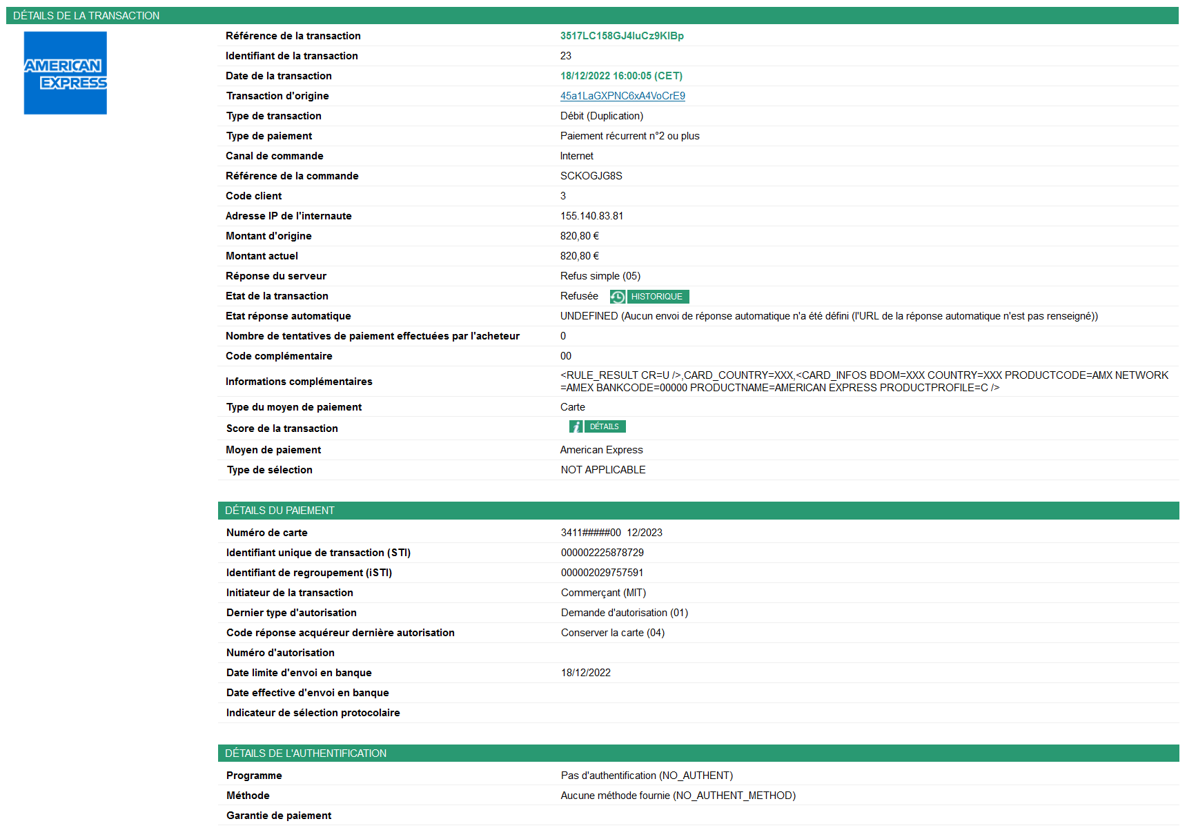 Si toutes les parties suivent les règles du processus d’authentification, American Express peut vous garantir le paiement de la transaction. Mercanet ne fournit aucune information sur la garantie de paiement offerte par American Express.