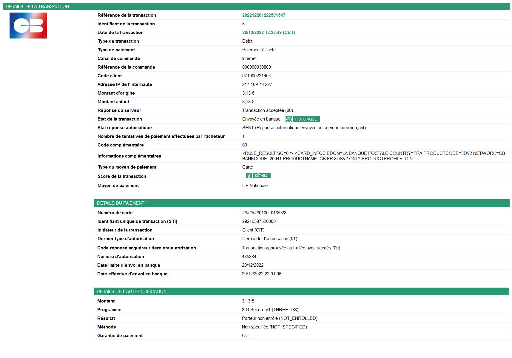 Merci de vous référer au document Guide 3DS pour analyser les informations d'authentification.