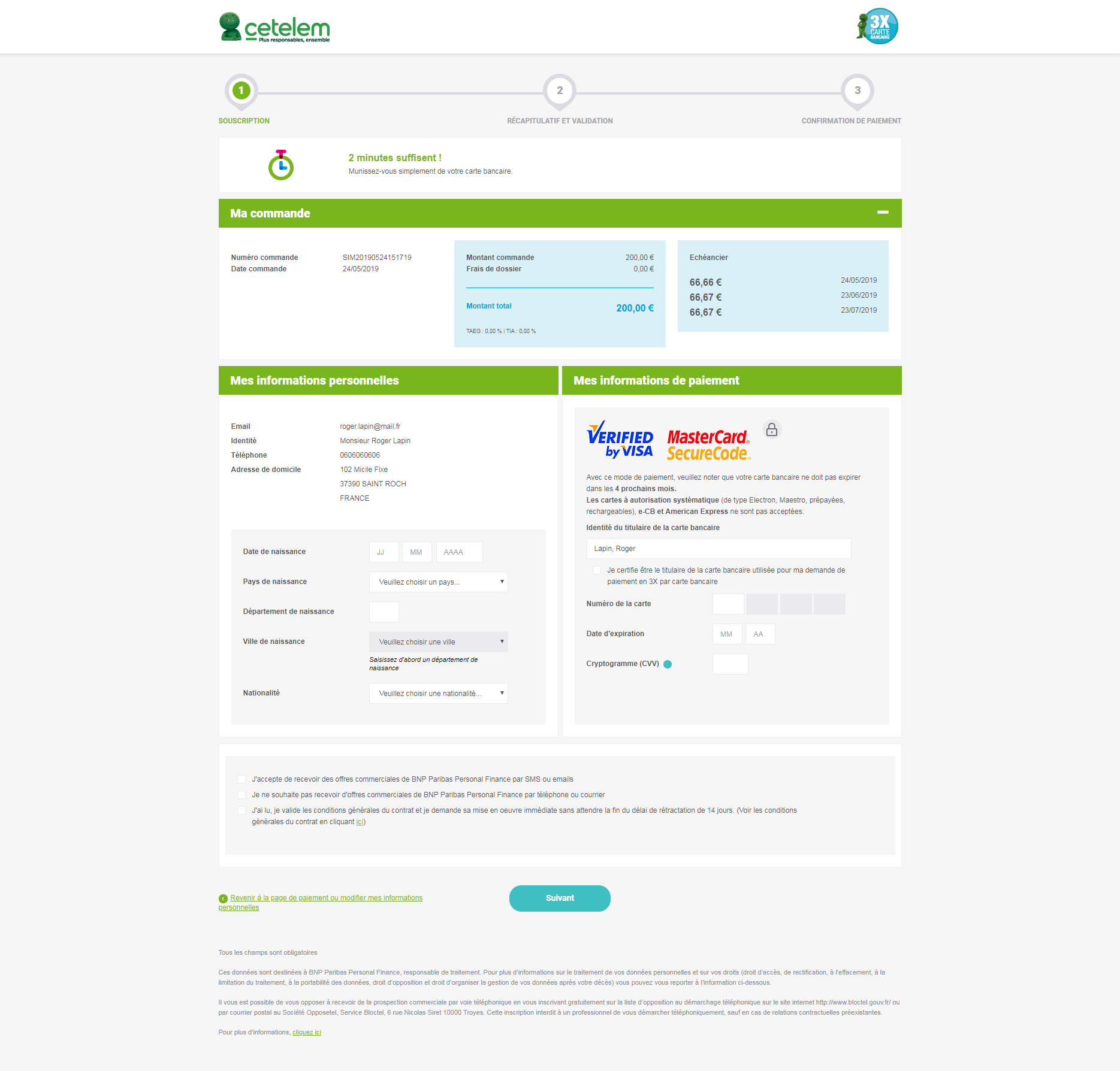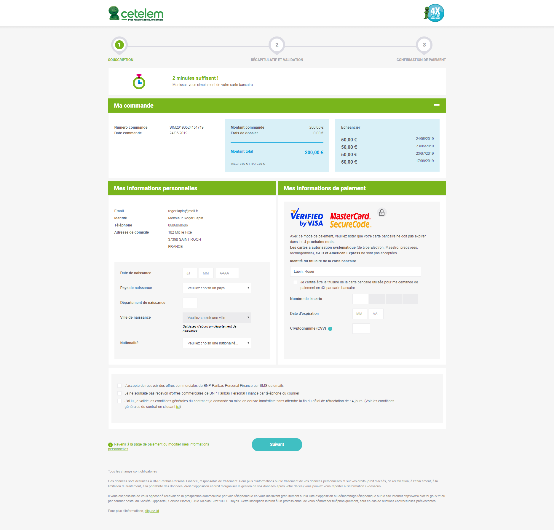 Le client est ensuite redirigé vers la page de la saisie des informations requises pour un paiement Cetelem 3X 4XCB :