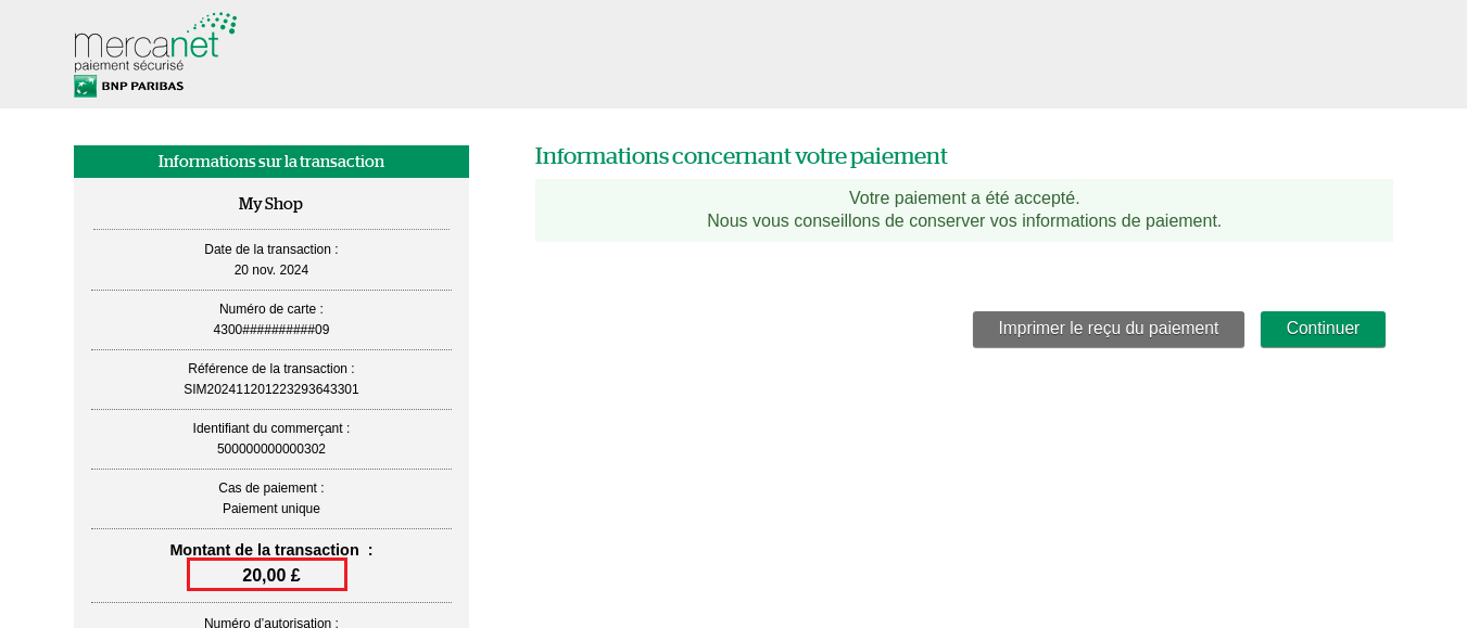 | transactionReference généré par Mercanet | Traitement standard | N/A | généré par Mercanet et affiché en rouge |