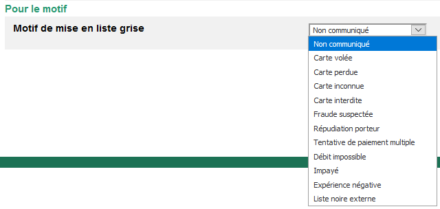 La partie droite du tableau définit l'opération possible et disponible pour une transaction dont la carte est en liste grise.