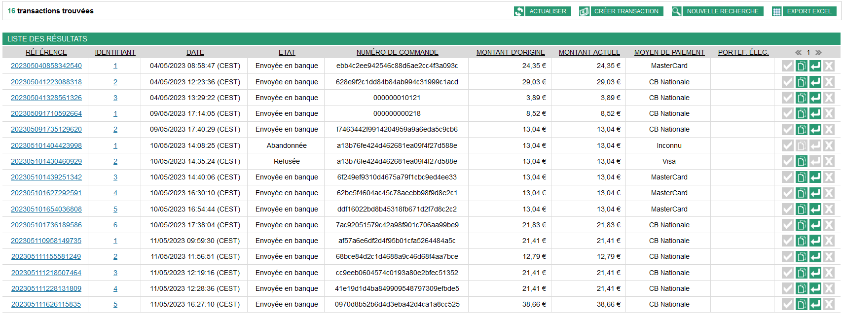 | Dupliquer une transaction | À envoyer en banque, à valider (avec autorisation), à valider (sans autorisation), en attente de demande d'autorisation, envoi en banque refusé, envoyée en banque, expirée, fraude suspectée, refusée, remboursement à envoyer en banque, remboursée |
