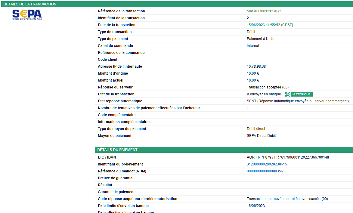 Pour visualiser le détail d’un prélèvement, cliquez sur l’identifiant du prélèvement correspondant. Une redirection sur l’onglet « Transactions » permet d’afficher le détail du prélèvement SEPA Direct Debit.
