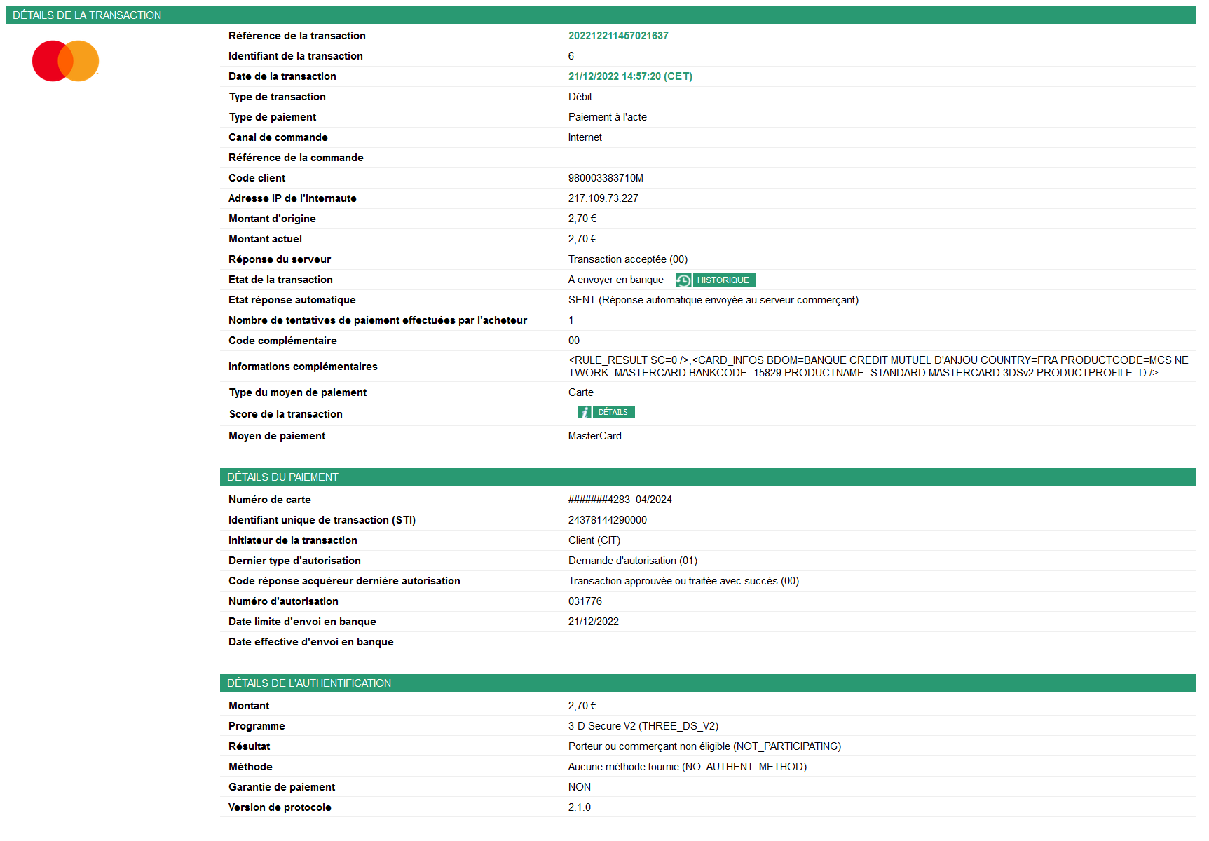 Si la transaction est trouvée, la page suivante s'affiche :