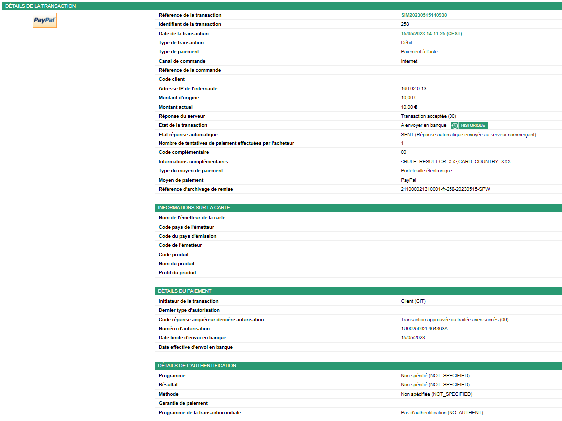 Voici le détail d’une transaction PayPal. Certaines informations spécifiques sont affichées comme le numéro d’autorisation PayPal.