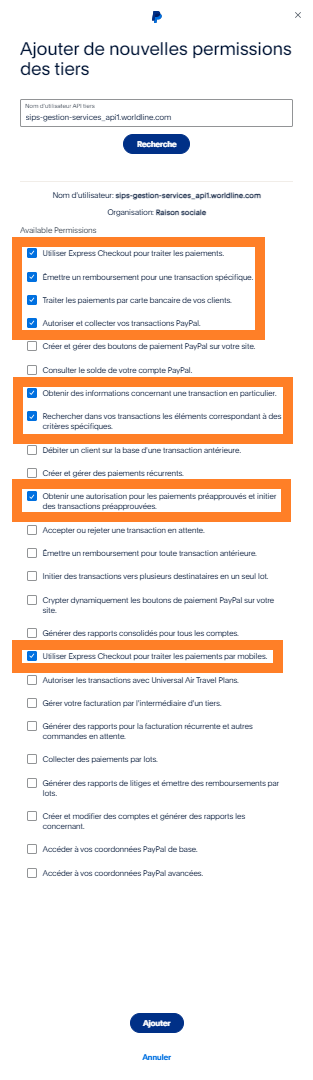 Sur votre compte PayPal, vous devez, en tant que commerçant, autoriser le prestataire de services de paiement (PSP) à appeler l'API de PayPal.