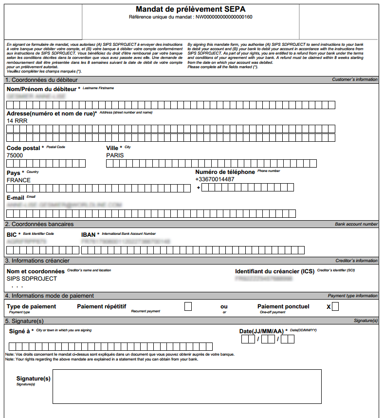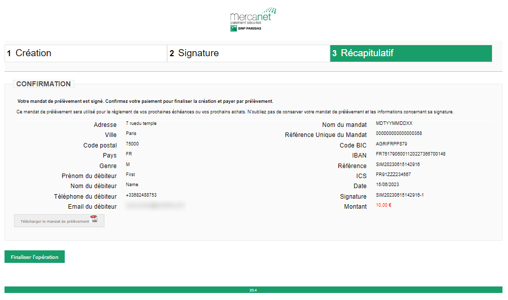 - Vous devez transmettre les données d’identification et les coordonnées du client. Ces dernières ne peuvent pas être modifiées par le client lors de la création de son mandat.